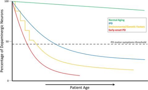 Dopamine levels in a normal person vs. Parkinson’s patient